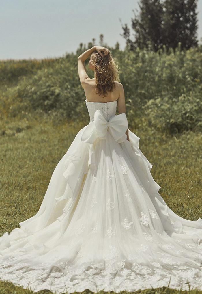 背中で存在感を放つ大きなバックリボンが、後ろ姿を可憐に彩るアクセントに。