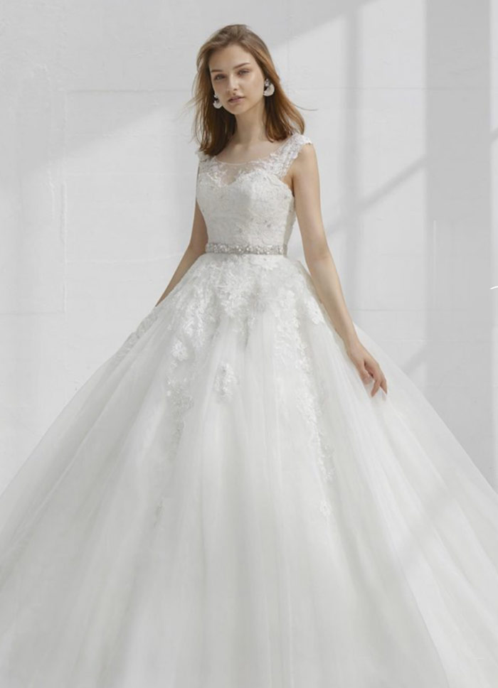 プリンセスラインのウェディングドレスは、ウエスト位置で切り替わり、スカートがボリュームたっぷりに広がるデザインが特徴。