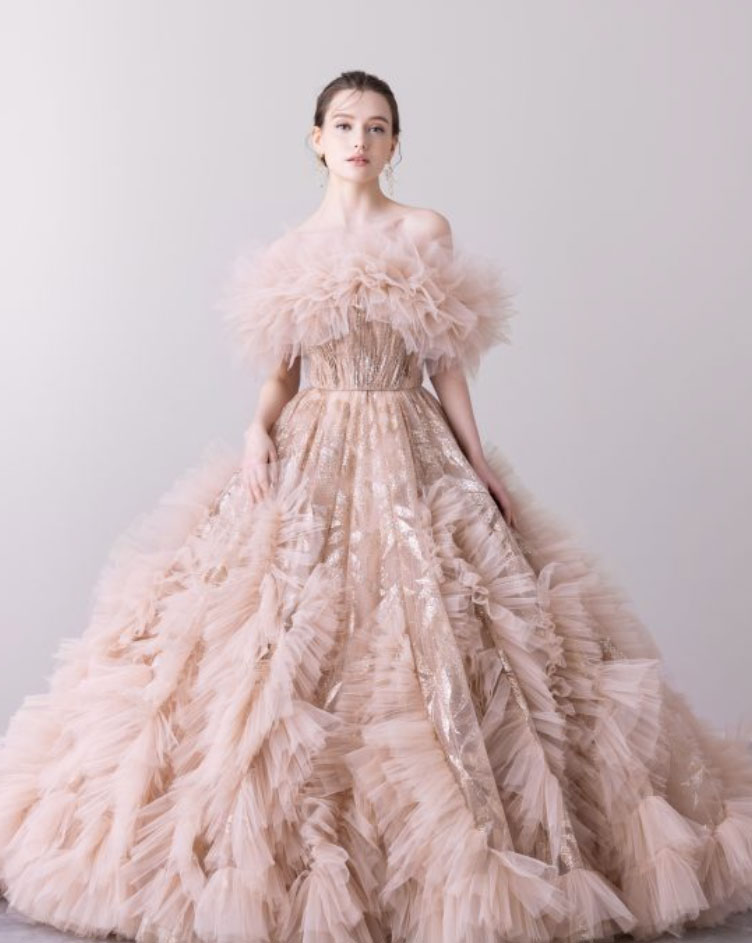 くすみベージュのニュアンスカラーは品があり、ボリュームのある装飾でも大人っぽくおしゃれに着こなせます。