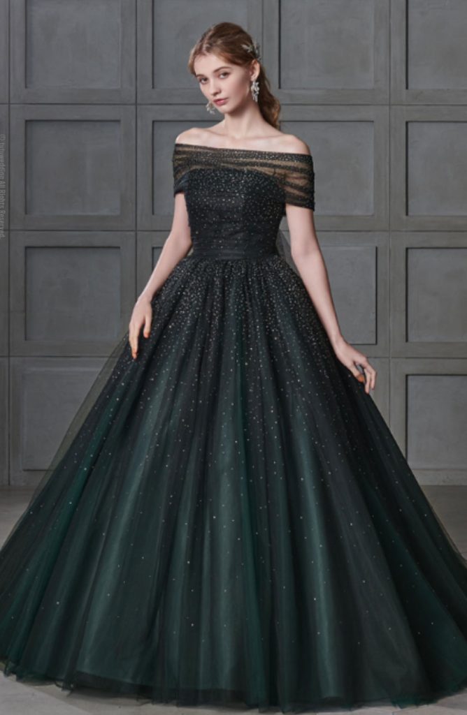 ダークなグリーンのドレスにきらきらと光るビジューを散りばめたドレス。