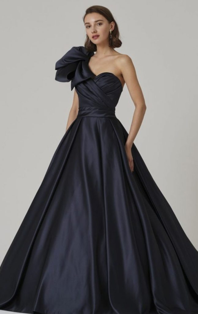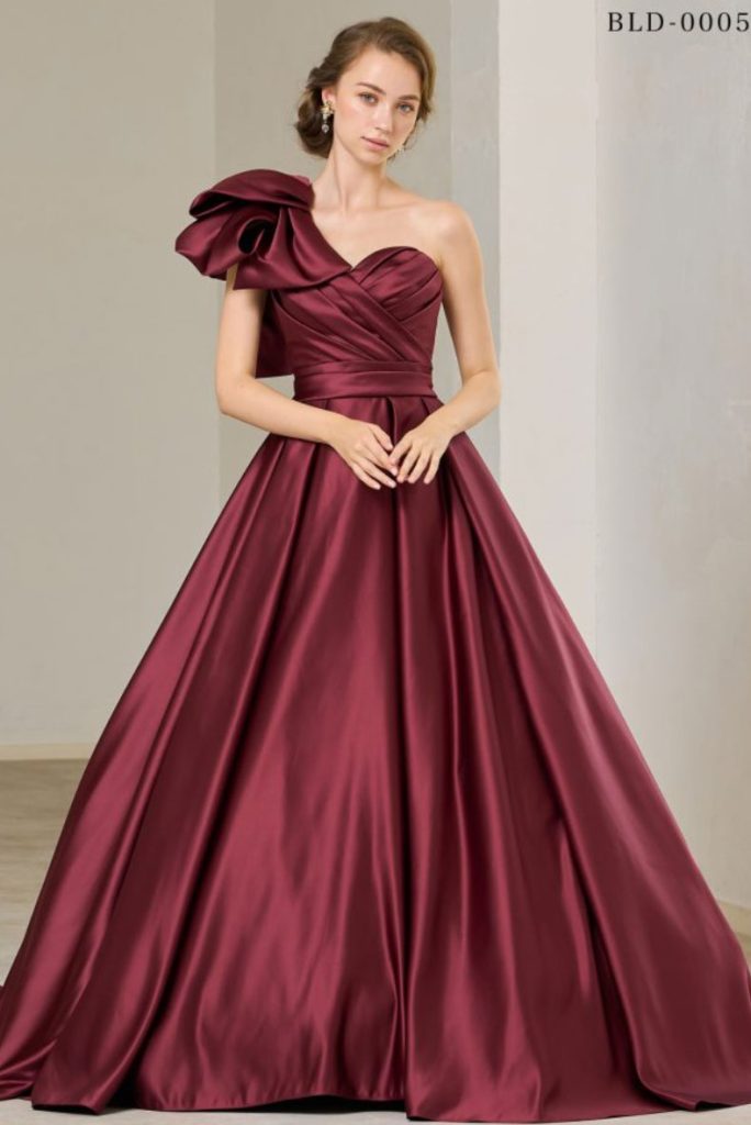 ツヤのある上質な生地にドレープが優雅に映え、ワンショルダーのデザインも上品さを演出。