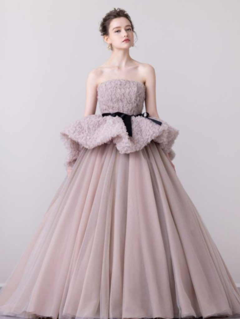 スカート部分が少しピンクがかったベージュ系カラードレスは、大人の女性の肌になじみやすい柔らかな色合いが魅力。