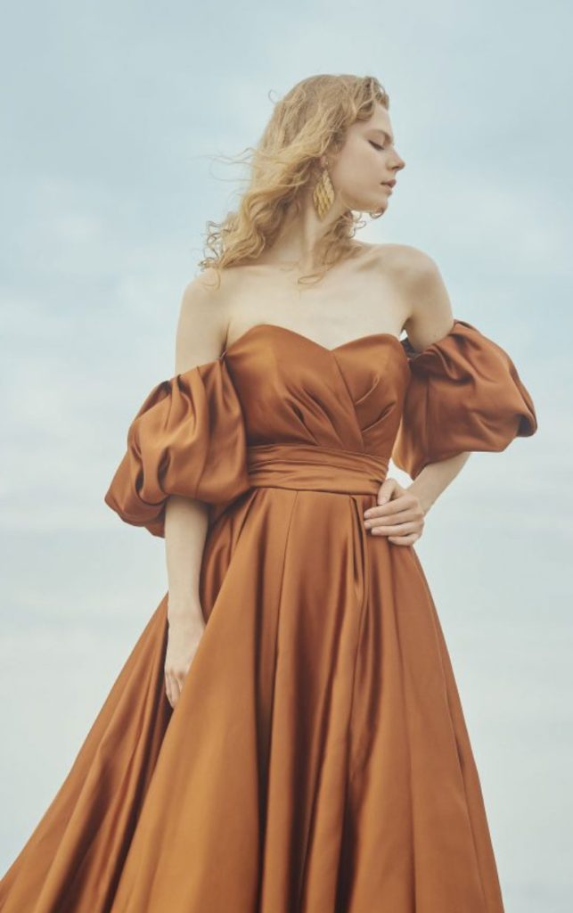 上品な光沢が美しいテラコッタカラーのノーブルなドレス。