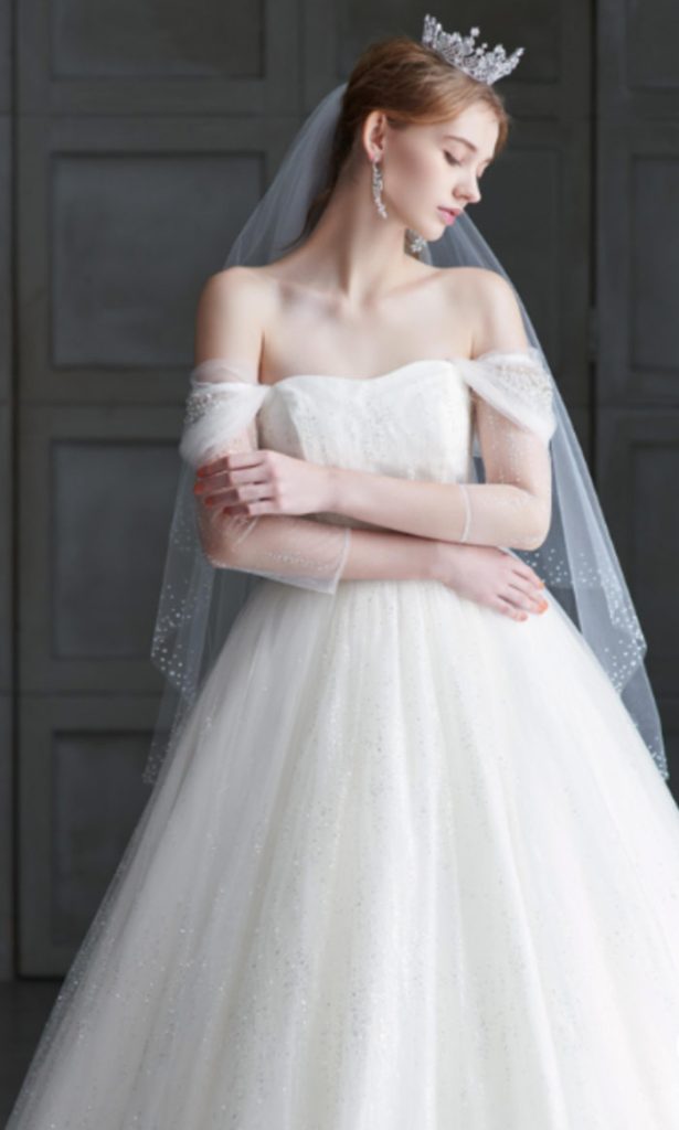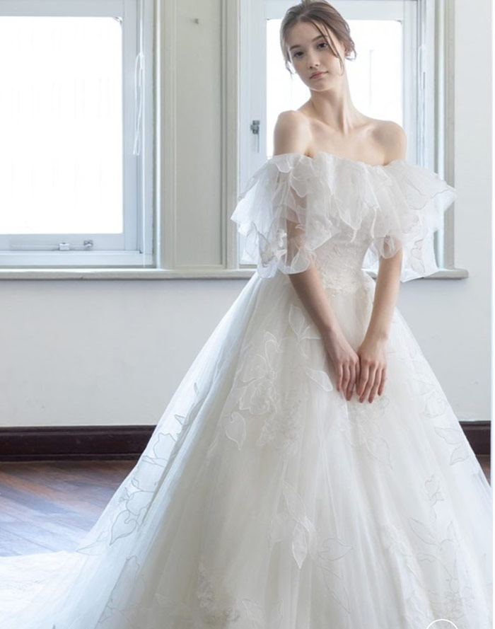 二の腕を優しく包み込むような透け感のあるオフショルダーも美しく、透明感を感じさせてくれますよ♪