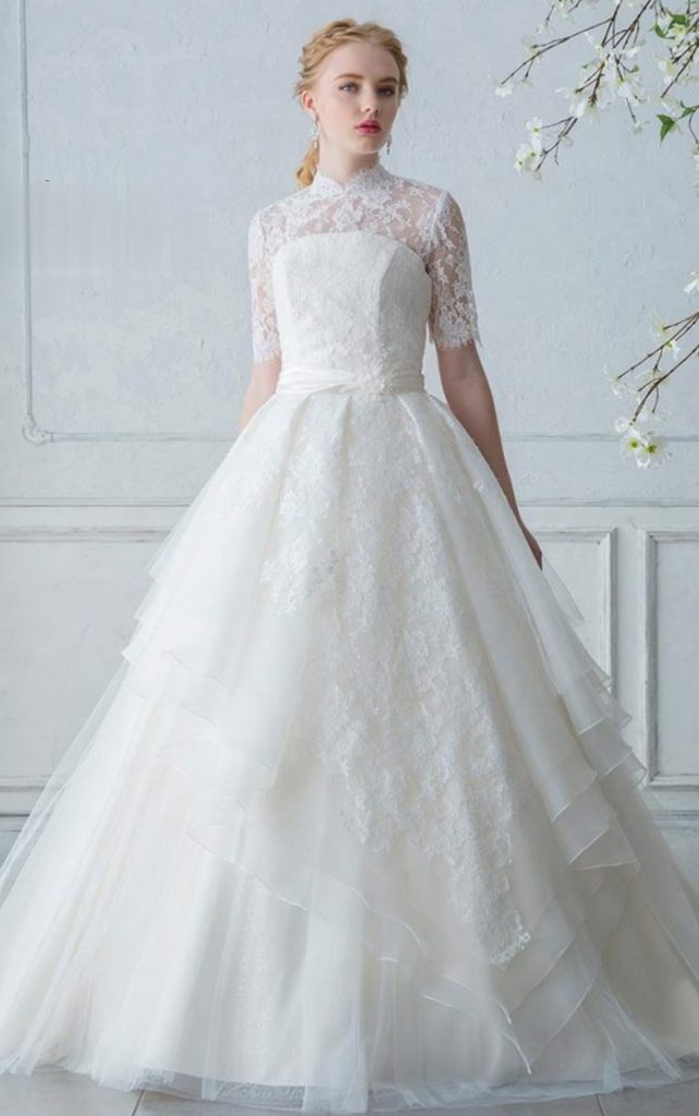 取り外しができる長袖は、ヌーディーなチュールを使うことでレースの美しさを際立たせ、優雅な女性らしさを表現しています。